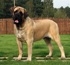 Главное в облике мастифа - пропорции. Корпус массивный, немного растянутый. Голова большая, широкая в черепной части, на лбу складки кожи. На короткой квадратной морде - черная маска. Уши висячие. Спина и поясница широкие, мускулатура мощная. Лапы большие, круглые, со сводистыми пальцами. Шерсть короткая, прилегающая, с мягким подшерстком. Окрас: абрикосовый, серо-палевый, тигровый на палевом фоне.